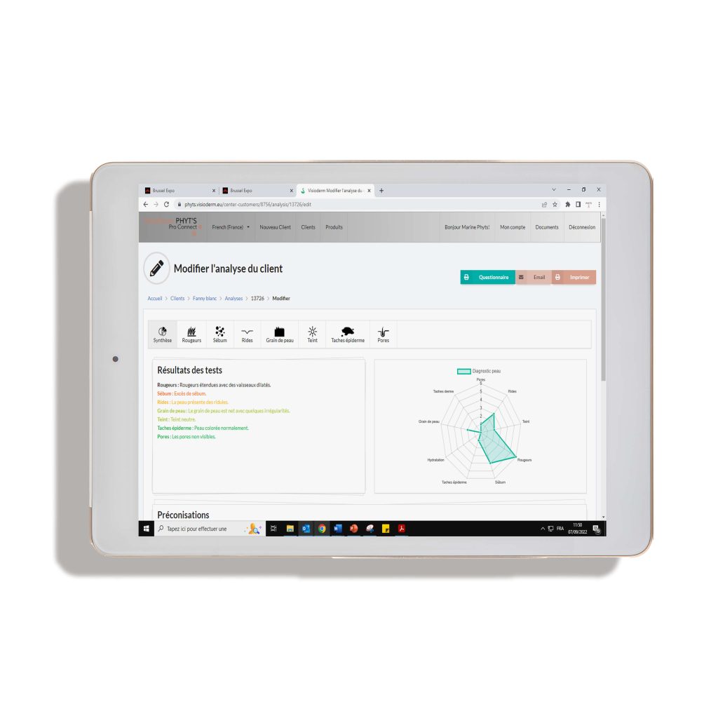 En outre, nos partenaires ont désormais la possibilité de vous proposer un diagnostic de peau digital, grâce à Visioderm Phyts pro connect, notre analyseur breveté, unique, innovant, fabriqué en France.